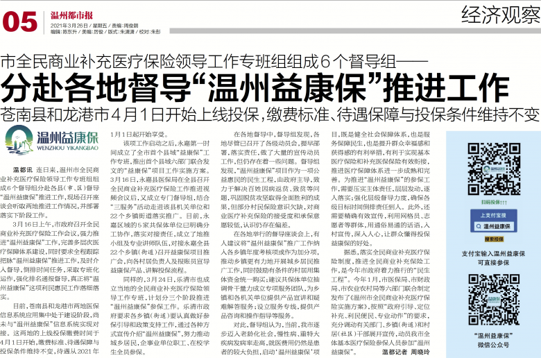 3月16日上午,市政府召開全民商業(yè)補(bǔ)充醫(yī)療保險(xiǎn)工作會議,強(qiáng)力推進(jìn)“溫州益康!惫ぷ鳎晟贫鄬哟吾t(yī)療保障體系建設(shè),同時(shí)要求全程跟蹤把脈“溫州益康保”推進(jìn)工作,及時(shí)介入督導(dǎo),倒排時(shí)間任務(wù),采取專班化運(yùn)作,強(qiáng)化排名通報(bào)督導(dǎo),真正將“溫州益康保”這項(xiàng)利民惠民工作落細(xì)落實(shí)。目前,蒼南縣和龍港市兩地醫(yī)保信息系統(tǒng)應(yīng)用集中處于建設(shè)階段,尚未與“溫州益康保”信息系統(tǒng)實(shí)現(xiàn)對接。這兩地的上線投保繳費(fèi)時(shí)間于4月1日開始,繳費(fèi)標(biāo)準(zhǔn)、待遇保障與投保條件維持不變,待遇從2021年1月1日起開始享受。