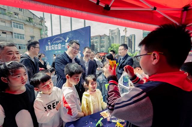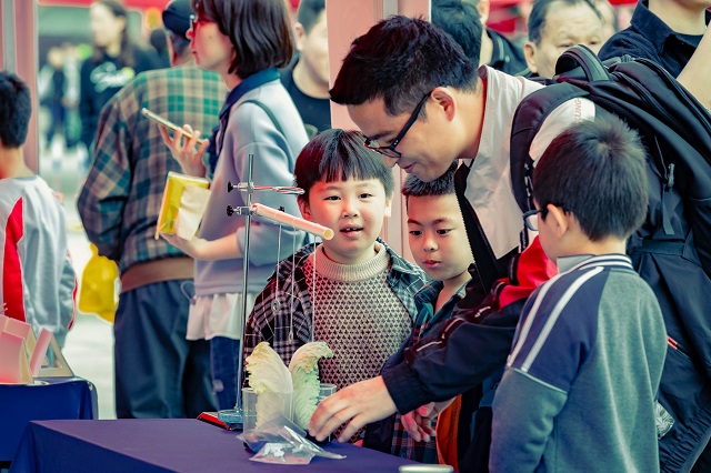 觀展的孩子和家長(zhǎng)饒有興趣地參與各個(gè)家庭實(shí)驗(yàn)室攤位的科學(xué)演示和互動(dòng)交流。
