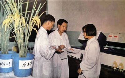 超高產(chǎn)遲熟中秈品種‘科字六號(hào)’全生育期155天左右,而榮獲1983年國(guó)家發(fā)明獎(jiǎng)一等獎(jiǎng)的新品種‘原豐早’成熟期提早45天左右,有效緩解前后作之間季節(jié)矛盾。圖為主要育成者王汀華(中)、王賢裕(右)、孫漱薌在考察品種特性。(資料照片)