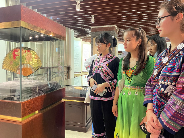 王星記作為一家百年老字號扇子生產廠家,是我國制扇業(yè)中產量最大,花色品種最多的一家綜合性扇廠。在同學們與浙江省工藝美術大師俞備紅交流中,畬族同學鐘奕的服飾引起了她的注意。“我扇子上的圖案取材于浙江,我覺得也可以取他們民族服飾的圖案,與扇子相結合,共同傳播畬族文化!”俞備紅聽完鐘奕同學對畬族服飾介紹后說。