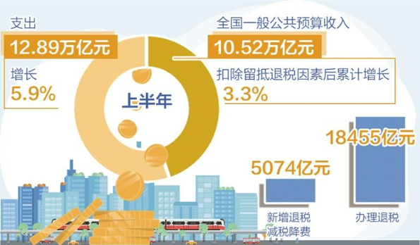 總體看,今年上半年預(yù)算執(zhí)行情況總體較好。統(tǒng)計顯示,上半年全國一般公共預(yù)算收入105221億元,扣除留抵退稅因素后累計增長3.3%;支出12.89萬億元,同比增長5.9%,高于財政收入增幅。此外,上半年新增退稅減稅降費5074億元、辦理退稅18455億元,有效提振市場主體信心;累計發(fā)行新增專項債券3.41萬億元。