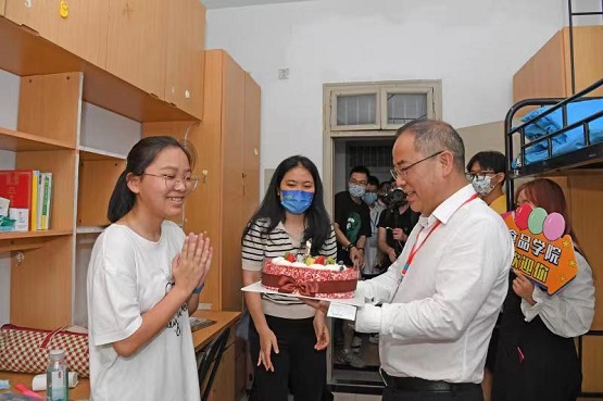 “大學(xué)報(bào)到第一天,剛好趕上自己過(guò)生日,第一次離開父母過(guò)生日還真不習(xí)慣,也不知道該準(zhǔn)備什么。光顧著準(zhǔn)備開學(xué)的東西,都忘了生日可以吃蛋糕!笔称放c生物工程學(xué)院新生明靜來(lái)自海寧,收到蛋糕的時(shí)候非常激動(dòng),“學(xué)校居然記得我的生日,書記還給我題字,開啟我大學(xué)生活的序幕,這太讓我驚喜了!”
