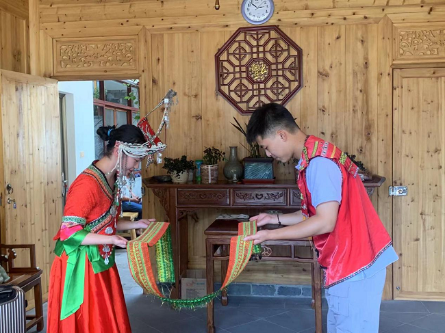 景寧澄照鄉(xiāng)金坵村是一個(gè)典型的畬漢群眾聚居的特色村落,畬族人口數(shù)占總?cè)丝跀?shù)的42%,曾獲中國(guó)傳統(tǒng)村落、省民族十佳特色村寨等榮譽(yù)。在一間別有生趣的茶室,實(shí)踐團(tuán)學(xué)生們見(jiàn)到了現(xiàn)任村黨總支書記蘭文忠,饒有興趣地傾聽(tīng)金坵村蝶變的故事。金坵村——這個(gè)過(guò)去人均年收入僅為185元的小山村,如今已成為人均年收入超3.17萬(wàn)元、村集體資產(chǎn)超千萬(wàn)元的小康村。蘭文忠書記自豪地說(shuō),在金坵一眼就能認(rèn)出迎面走來(lái)的村民是畬族還是漢族——村里的畬民一年四季都穿畬服,村里還給他們發(fā)放傳統(tǒng)服飾的置裝補(bǔ)貼。目前,村里將畬鄉(xiāng)傳統(tǒng)文化創(chuàng)新為特色的鄉(xiāng)村文旅,和旅游公司合作打造畬族婚嫁習(xí)俗等相關(guān)展演。據(jù)悉,金坵村在2021年的游客量達(dá)到20余萬(wàn)人次,村集體經(jīng)濟(jì)年收入超50萬(wàn)元,真正實(shí)現(xiàn)了民族文化賦能鄉(xiāng)村增彩。