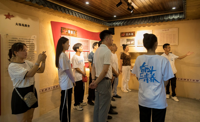 在畬族革命歷史展覽館外墻,紅色大字寫道:“畬族有很好的革命傳統(tǒng),在整個(gè)大革命時(shí)期,畬族沒(méi)有出過(guò)一個(gè)叛徒,這是很了不起的事情!边@副大字是習(xí)近平總書記的標(biāo)注。在展廳內(nèi),實(shí)踐團(tuán)成員們認(rèn)真學(xué)習(xí)景寧畬族革命斗爭(zhēng)史和大張坑村革命斗爭(zhēng)事跡,感悟畬族人民前赴后繼、英勇抗?fàn)幍摹爸矣隆本!拔覀兠考颐繎舳紥熘蠹t燈籠,夜晚很美。就像紅軍點(diǎn)燃的火種,世代傳承、守護(hù)著村民!贝髲埧哟逦幕Y堂工作人員這樣給學(xué)生們介紹道。