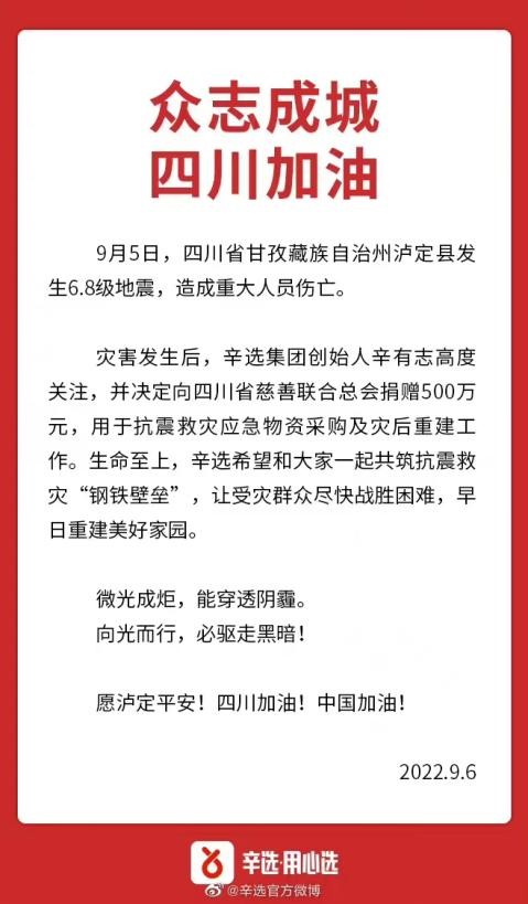 9月5日12時(shí)52分,四川省甘孜藏族自治州瀘定縣發(fā)生6.8級(jí)地震,造成重大人員傷亡。9月6日,辛選集團(tuán)創(chuàng)始人辛有志(網(wǎng)名辛巴)決定捐贈(zèng)500萬元現(xiàn)金馳援地震災(zāi)區(qū),用于當(dāng)?shù)乜拐鹁葹?zāi)應(yīng)急物資采購及災(zāi)后重建工作。