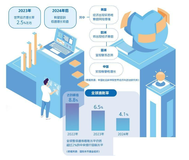 根據(jù)中國社會(huì)科學(xué)院世界經(jīng)濟(jì)與政治研究所的測算,2023年世界經(jīng)濟(jì)增長率為2.5%左右。2024年后,全球經(jīng)濟(jì)有望回到低速增長的軌道。