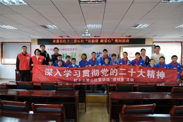3月14日,紅十三愛心社志愿者到永嘉縣下塘小學(xué)進(jìn)行黨的二十大精神宣講,為孩子們送上零食大禮包和獎學(xué)金。