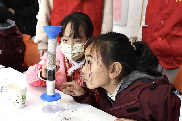 日前,杭州市錢塘區(qū)白楊街道云濱社區(qū)的活動(dòng)室里,孩子們秉著呼吸聆聽著水滴落的聲音,渾濁的污水經(jīng)過凈水器層層過濾后變成清澈的水滴落在收集器里,孩子們瞬間爆發(fā)出陣陣的歡呼聲。