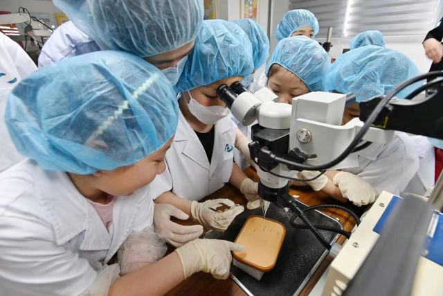 在微觀體驗室,孩子們學習了規(guī)范的七步洗手法,第一次用外科顯微鏡觀察了傷口縫合,用手術剪刀給傷口拆線?破震^工作人員張赟告訴記者,這一看一剪,主要考驗手眼協(xié)調能力,同時他也想告訴大家,眼睛是很嬌弱的器官,要好好保護眼睛。