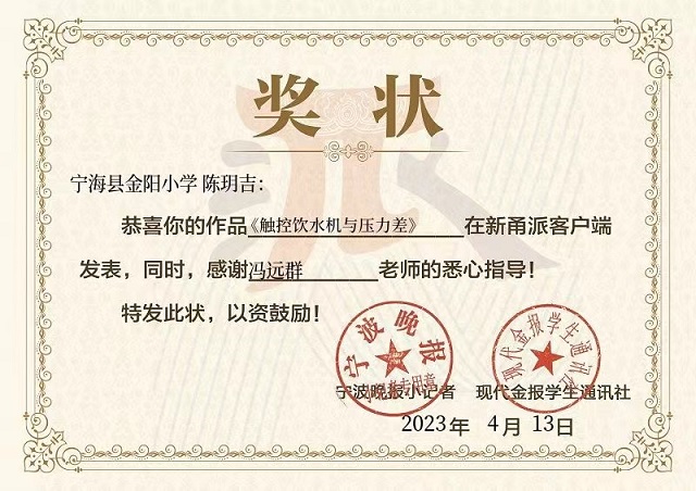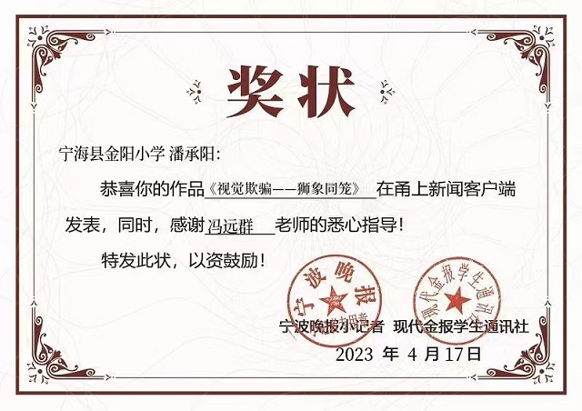 日前,寧?h金陽(yáng)小學(xué)陳玥吉同學(xué)的《觸控飲水機(jī)與壓力差》與潘承陽(yáng)同學(xué)的《視覺欺騙——獅象同籠》先后被新甬派客戶端刊發(fā),并各自收到了《寧波晚報(bào)》《現(xiàn)代金報(bào)學(xué)生通訊社》聯(lián)署的獎(jiǎng)狀,為金陽(yáng)小學(xué)科普教育再添喜報(bào)。