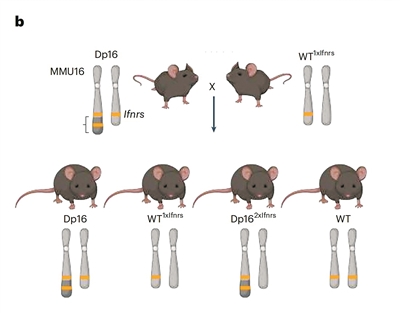 唐氏綜合征是一種遺傳病,患者所有細(xì)胞的21號(hào)染色體都有3個(gè)拷貝,而不是正常的兩個(gè)拷貝。21號(hào)染色體內(nèi)有一組免疫相關(guān)基因,也稱IFNR基因簇。然而,21號(hào)染色體的這個(gè)多余拷貝如何導(dǎo)致了這種疾病仍然不明確。之前曾利用小鼠研究過(guò)這種疾病,因?yàn)榕c人類21號(hào)染色體對(duì)應(yīng)的基因組區(qū)域有一個(gè)多余拷貝的小鼠也表現(xiàn)出人類唐氏綜合征患者的許多特征。