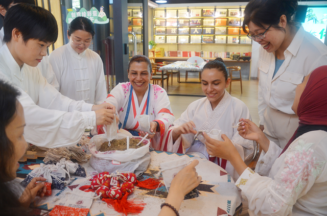 當(dāng)天,義烏市中醫(yī)醫(yī)院的醫(yī)務(wù)人員走進(jìn)江東街道雞鳴山社區(qū),與外國(guó)友人開(kāi)展零距離“沉浸式”中醫(yī)藥體驗(yàn)活動(dòng)。通過(guò)手工制作中藥香囊、八段錦展示教學(xué)活動(dòng),讓外國(guó)友人們感受中國(guó)傳統(tǒng)節(jié)日氣氛同時(shí)體驗(yàn)中國(guó)傳統(tǒng)醫(yī)藥文化的非凡魅力,感受中國(guó)文化之博大精深。