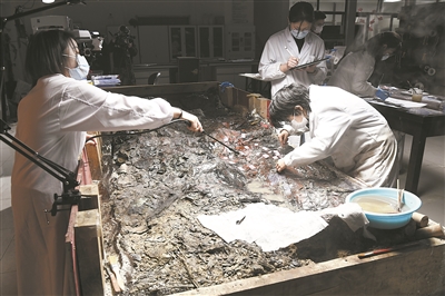 “像曾侯寶墓葬M168這樣的遺存,在野外環(huán)境下連續(xù)發(fā)掘4年幾乎不可能,尤其是其漆皮對空氣濕度非常敏感,它被從高濕度的淤土轉移到低濕度的空氣中時,很容易卷邊、起翹甚至脫落,影響發(fā)掘價值!敝炖谙蚩萍既請笥浾邚娬{,“我們在實驗室里搭建了大棚,用工業(yè)加濕器、化學方法保濕,保證了漆皮的韌性和濕度,為發(fā)掘爭取了時間!