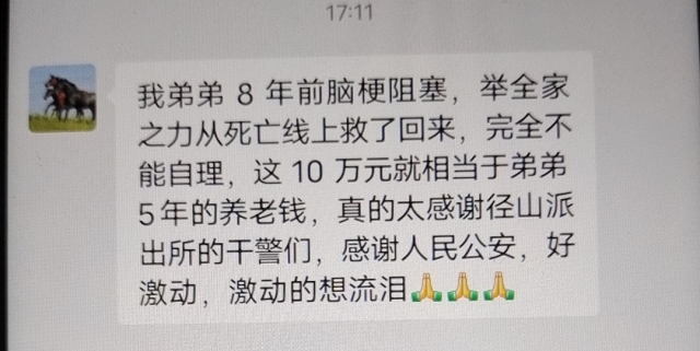 “我弟弟8年前腦梗阻塞,舉全家之力從死亡線上救了回來,完全不能自理,這10萬元就相當(dāng)于弟弟5年養(yǎng)老錢,真的太感謝徑山派出所的干警們,感謝人民公安,好激動(dòng),激動(dòng)得想流淚!〞 8月1日,在杭州市公安局余杭區(qū)分局徑山派出所接警大廳內(nèi),張女士激動(dòng)地感謝民警,沒想到時(shí)隔一個(gè)多月,自己被騙的10萬元,還能挽回來。