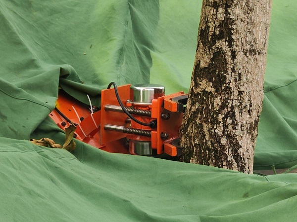 學(xué)生團(tuán)隊(duì)由10多名學(xué)生組成,既有研究生也有本科生,既有機(jī)械專業(yè)學(xué)生也有林學(xué)等專業(yè)的學(xué)生,他們專業(yè)互補(bǔ)、協(xié)同研發(fā)。研發(fā)團(tuán)隊(duì)學(xué)生負(fù)責(zé)人、該校研一學(xué)生鄭恒意介紹說(shuō),他們研發(fā)的機(jī)器人以六連桿折展單元構(gòu)成的倒傘型折展機(jī)構(gòu)作為果實(shí)收集裝置,不需要人在設(shè)備上操作,通過相關(guān)的程序進(jìn)行控制。此外,機(jī)器底座自重1.3噸,傾斜角度超過30度也能保持平衡。其獨(dú)特的結(jié)構(gòu)賦予其較大的折展比,并通過伸縮桿的調(diào)節(jié),實(shí)現(xiàn)收集范圍的靈活調(diào)整,從而提高了機(jī)械的普適性,使其能夠適用于山核桃、油茶、板栗、銀杏、楊梅等十多種不同類型的林果采收。