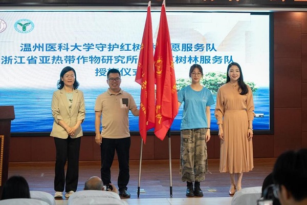 浙江省亞熱帶作物研究所所長(zhǎng)陳秋夏所長(zhǎng)和溫州醫(yī)科大學(xué)檢驗(yàn)醫(yī)學(xué)院(生命科學(xué)學(xué)院)黨委書(shū)書(shū)洪曉暢分別給兩家單位的紅樹(shù)林守護(hù)志愿服務(wù)隊(duì)授旗,授予小學(xué)生們紅樹(shù)林騎士稱(chēng)號(hào)證書(shū),希望他們進(jìn)一步弘揚(yáng)“奉獻(xiàn)、有愛(ài)、互助、進(jìn)步”的志愿精神。