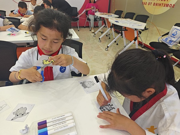 隨后,在公益老師的指導(dǎo)下,孩子們開始動(dòng)手制作自己的熱縮片鑰匙扣。選材、描圖、涂色、裁剪......孩子們積極動(dòng)手操作,相互討論,總結(jié)探索!拔业钠たㄇ鹞舶投伎炜床灰娏,畫的時(shí)候不夠長(zhǎng),熱縮片縮小后就顯得更短了。”二年級(jí)的易伊提醒小伙伴們要考慮熱縮片縮小后圖形變化;“我觀察后發(fā)現(xiàn)吹熱縮片要從外面一圈一圈地慢慢往中間吹,最后再用板壓平!本妥x三年級(jí)的陳雨則發(fā)現(xiàn)了吹熱縮片時(shí)的小技巧。小朋友們你一言我一語(yǔ)分享訣竅,糾正錯(cuò)誤,相互幫助,再一次動(dòng)手的時(shí)候,看著一個(gè)個(gè)精美的鑰匙扣,成就感滿滿。