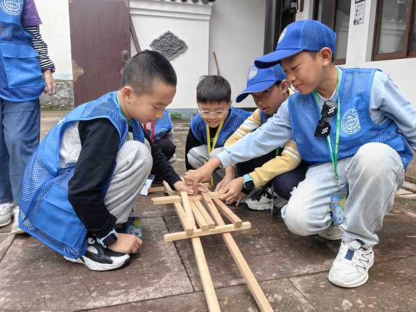 學(xué)完相關(guān)知識(shí)后,孩子對(duì)接下來的“搭建魯班橋”環(huán)節(jié)充滿期待。不費(fèi)一滴膠,不用一顆釘,只用幾根木頭就能搭建出一座橋。孩子們帶著好奇心,幾人一組,相互配合。“我們搭出來啦!”一些小朋友在經(jīng)過老師的簡(jiǎn)單指點(diǎn)后,成功搭建出“魯班橋”,興奮地向大家展示成果。隨后,老師一邊為大家進(jìn)行專業(yè)示范,一邊講解相關(guān)知識(shí),帶領(lǐng)大家深度學(xué)習(xí)中國古建的內(nèi)部結(jié)構(gòu)、力學(xué)原理,科學(xué)探索榫卯結(jié)構(gòu)的奧秘。