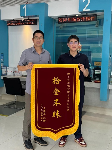 當失主見到完好無損的物品時,激動不已。這些設備不僅價值不菲,更存儲著重要工作資料和個人珍貴記憶。失主緊握朱澤鵬的雙手連聲道謝,并詢問其姓名與單位,盛贊其“拾金不昧,品德高尚”。5月29日,心懷感激的失主專程前往臺州銀行麗水縉云支行,向朱澤鵬贈送“拾金不昧”錦旗,對其展現(xiàn)的職業(yè)素養(yǎng)和社會責任感給予高度評價。