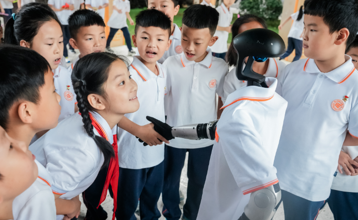 最燃時(shí)刻當(dāng)屬宇樹機(jī)器人登場(chǎng)!這個(gè)靈活的“鋼鐵明星”剛亮相就主動(dòng)揮手“打招呼”,引得全場(chǎng)驚呼。當(dāng)幾位幸運(yùn)同學(xué)受邀上臺(tái),機(jī)器人緩緩伸出機(jī)械臂與孩子們“握手”,指尖觸碰的瞬間,科技不再冰冷——有孩子興奮地說(shuō):“感覺(jué)像在和電影里的智能伙伴交朋友!”
