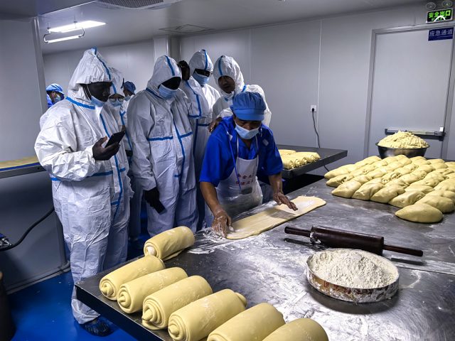 在“月餅之鄉(xiāng)”義烏市義亭鎮(zhèn),海外友人參觀了業(yè)界知名的億民食品廠,近距離觀摩義烏特色中秋月餅的制作流程。從和面、包餡到壓模、烘烤,大家仔細(xì)觀看每一個(gè)生產(chǎn)環(huán)節(jié),并不時(shí)用視頻記錄下這一陌生而有趣的制作過程。食品廠的工作人員也不斷向海外友人詳細(xì)介紹了月餅制作過程中所涉及到的一些科學(xué)知識(shí)。當(dāng)看到各式各樣的月餅從生產(chǎn)線末端整齊出爐時(shí),參觀隊(duì)伍中發(fā)出陣陣贊嘆。