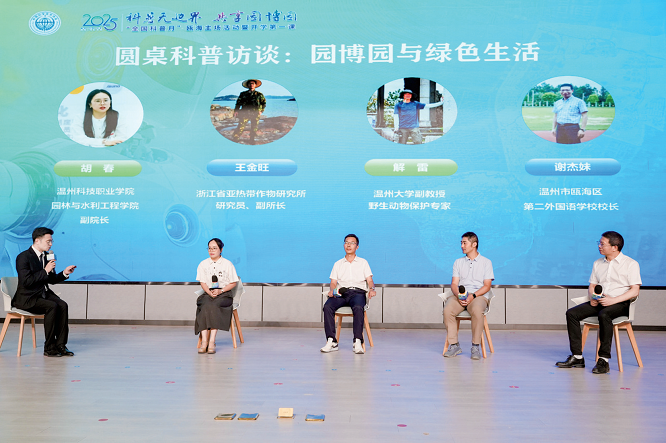 在圓桌訪談環(huán)節(jié),專家學(xué)者與教育工作者共同圍繞“園博園與綠色生活”展開交流。溫州科技職業(yè)學(xué)院副院長胡春暢談園林藝術(shù)如何走進市民日常,浙江省亞熱帶作物研究所副所長王金旺介紹珍稀植物保護的實例,溫州大學(xué)副教授解雷解讀甌海的野生動物資源,甌海二外校長謝杰妹則分享學(xué)校如何借勢園博會推進科普教育。