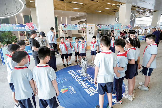 活動外場設(shè)置四大科普展區(qū),分別為園博主題設(shè)計展、科普教育基地聯(lián)展、部門科普展示以及學(xué)生自制科學(xué)展板與園博模型。展覽內(nèi)容涵蓋人工智能、花卉與植物、野生動物、海洋、地質(zhì)、食品安全、青春期健康等多個方面。孩子們在機器人和機器狗展區(qū)興奮互動,在花卉展臺記錄知識,在食品安全展位體驗小游戲,現(xiàn)場氣氛熱烈,科普真正“活”了起來。