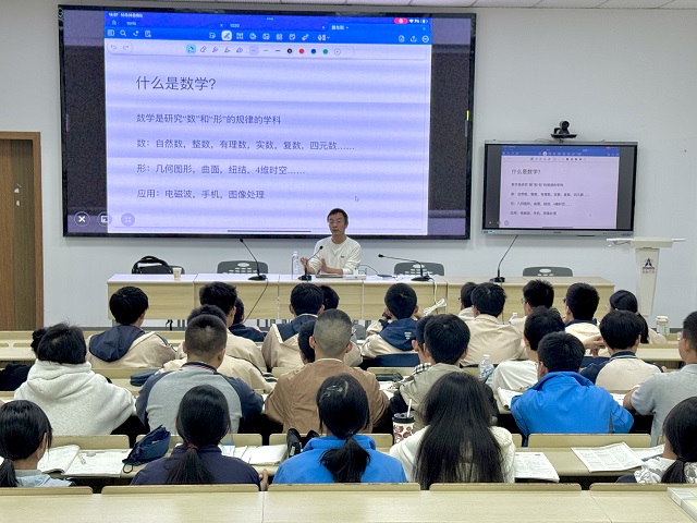 講座中,王楓從“什么是數(shù)學(xué)”這一問題切入,引導(dǎo)同學(xué)們思考數(shù)學(xué)的本質(zhì)。結(jié)合數(shù)學(xué)思維的特點(diǎn),向大家展示了數(shù)學(xué)作為一門精確語言的獨(dú)特魅力,他強(qiáng)調(diào),解決問題的核心在于理解問題、提出解決方案、陳述解答三個(gè)關(guān)鍵環(huán)節(jié)。通過初等數(shù)論中的舉例分析,將抽象的數(shù)學(xué)概念與生動(dòng)的“形”相結(jié)合,使同學(xué)們直觀感受到了數(shù)學(xué)的嚴(yán)謹(jǐn)與奧妙。此外,王教授還分享了關(guān)于數(shù)學(xué)競賽的知識,通過具體案例向?qū)W生們展示了數(shù)學(xué)問題的多樣性和挑戰(zhàn)性,他鼓勵(lì)大家在學(xué)習(xí)中保持好奇心和探索精神,不斷提升自己的數(shù)學(xué)思維能力。整場講座,王教授用深厚的學(xué)術(shù)功底和生動(dòng)的案例,層層剖析數(shù)學(xué)思維的本質(zhì),師生們紛紛表示受益匪淺。