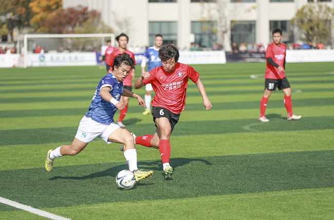 隨著張崇波宣布賽事開賽,現(xiàn)場彩煙噴射,旗幟揮舞。開幕式后,揭幕戰(zhàn)隨即打響,對陣雙方為廣化街道足球隊與濱江街道望江隊,兩支隊伍在綠茵場上展開了激烈的角逐,上半場,雙方多次上演頭球、遠射、吊射等精彩進攻,卻均未能突破對方堅固防線。場下,觀眾席內更形成了“藍紅對壘”的助威格局,雙方球迷的加油聲此起彼伏,甚至蓋過了賽場廣播的聲音。