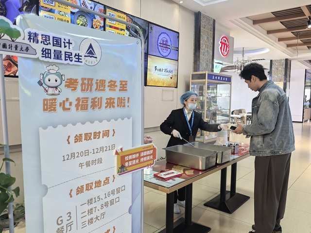 考試期間恰逢冬至,為了讓考生感受到“家”一般的溫暖,學(xué)校特意準(zhǔn)備了一份小驚喜:后勤服務(wù)中心在餐廳開設(shè)助考專窗,考生憑準(zhǔn)考證即可免費領(lǐng)取一份湯圓或水餃。這讓浙江財經(jīng)大學(xué)張同學(xué)倍感暖心:“味道很好,六顆湯圓還寓示著‘六六大順’,學(xué)校的這份用心我接收到了!