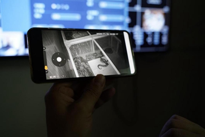 大宸農(nóng)業(yè)負(fù)責(zé)人現(xiàn)場(chǎng)演示蛇房監(jiān)控系統(tǒng)。蔣飛/攝